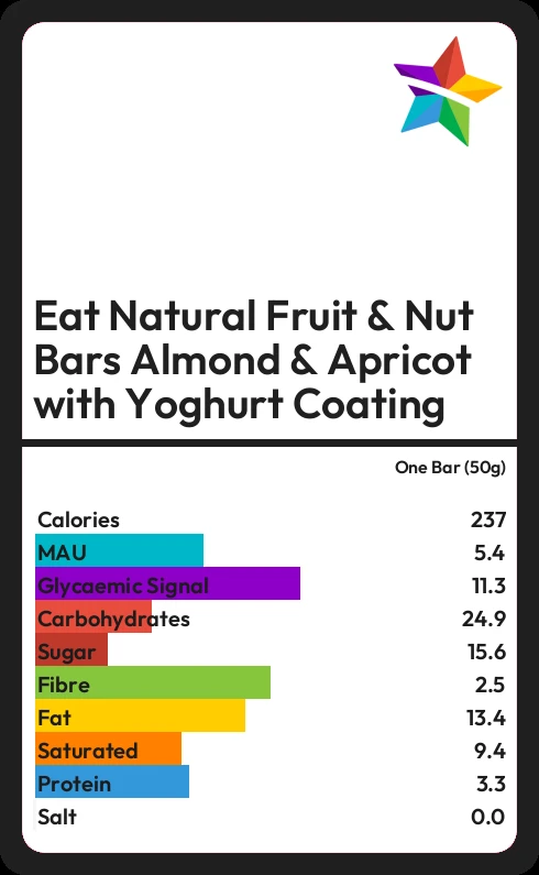 Eat Natural Fruit & Nut Bars Almond & Apricot with Yoghurt Coating contains 15.6g sugar in one Bar (50g) - that is around 4 cubes of sugar.