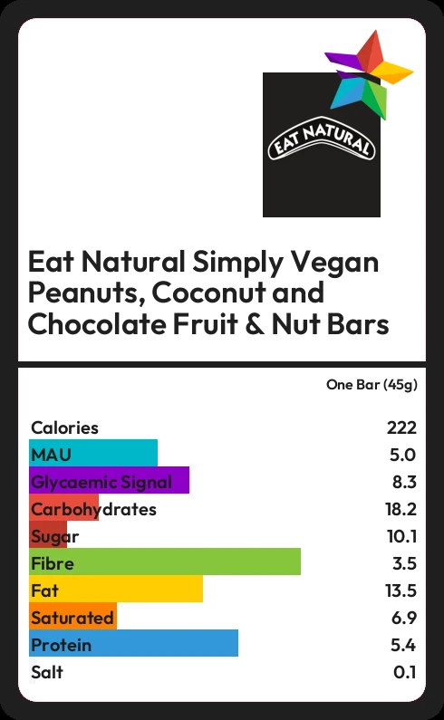 Eat Natural Simply Vegan Peanuts, Coconut and Chocolate Fruit & Nut Bars contains 221.9 calories in one Bar (45g).