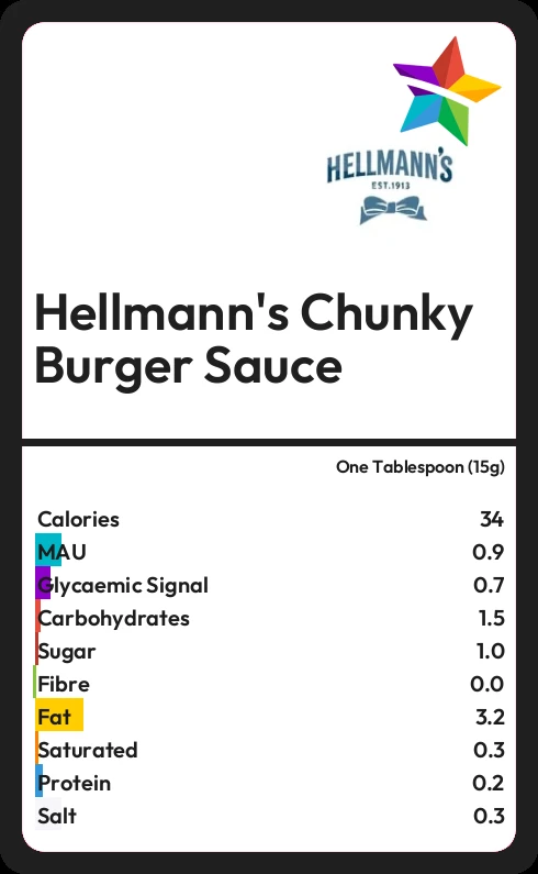 In one Tablespoon (15g) of Hellmann's Chunky Burger Sauce there are 3.2g of fat of which 0.3g are saturated.