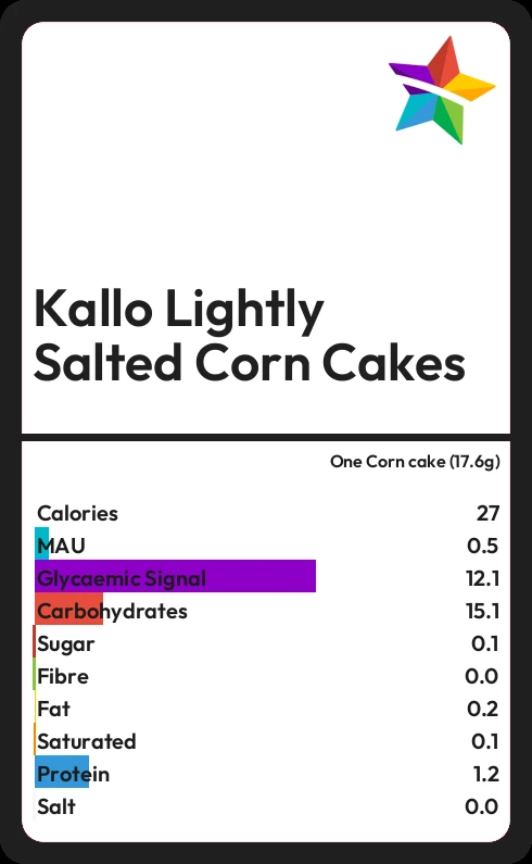 Kallo Lightly Salted Corn Cakes contains 0.1g sugar in one Corn cake (17.6g)