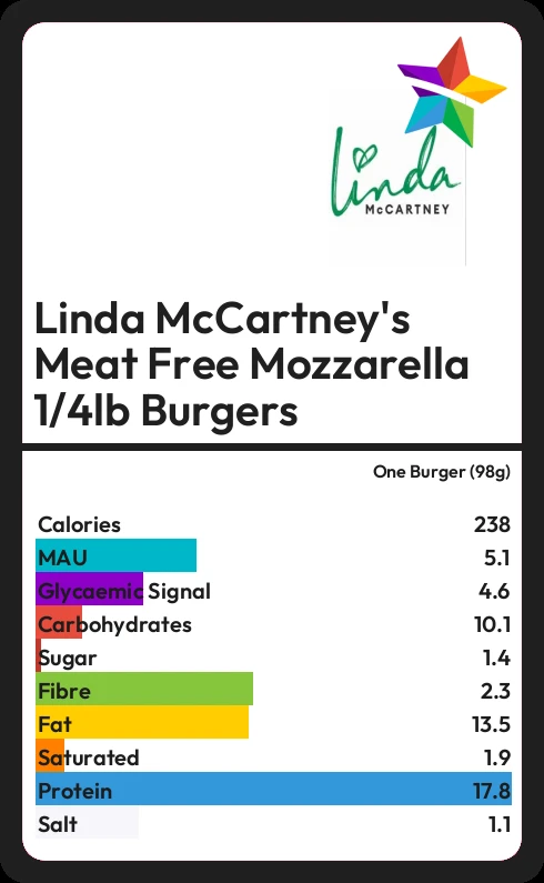 Linda McCartney's Meat Free Mozzarella 1/4lb Burgers contains 238.1 calories in one Burger (98g).