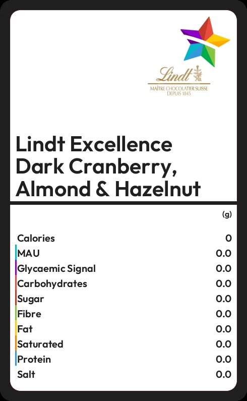 In 100g of Lindt Excellence Dark Cranberry, Almond & Hazelnut there are 30.0g of fat of which 17.0g are saturated.
