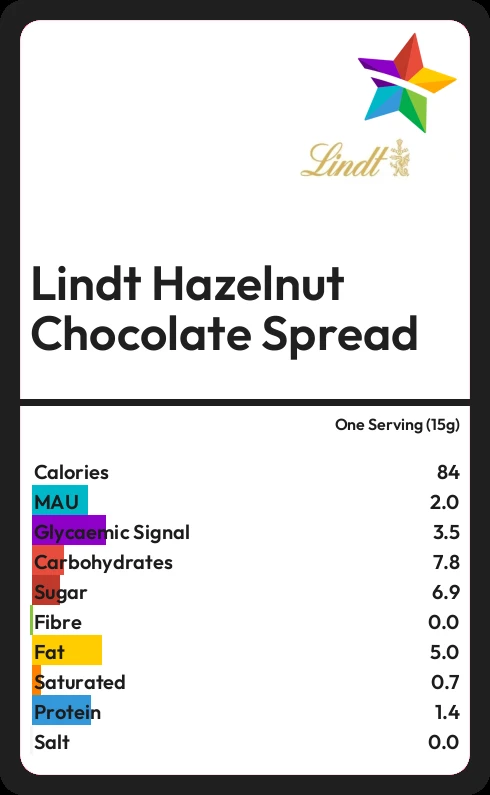 Lindt Hazelnut Chocolate Spread contains 6.9g sugar in one Serving (15g) - that is around 2 cubes of sugar.