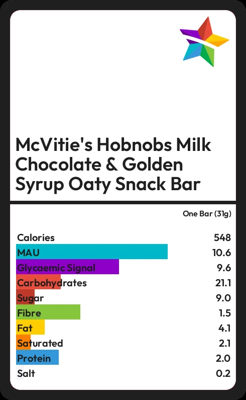 McVitie's Hobnobs Milk Chocolate & Golden Syrup Oaty Snack Bar contains 548.1 calories in one Bar (31g).