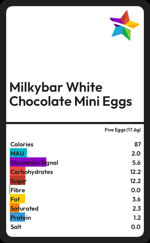 Milkybar White Chocolate Mini Eggs contains 12.2g sugar in five Eggs (17.6g) - that is around 3 cubes of sugar.