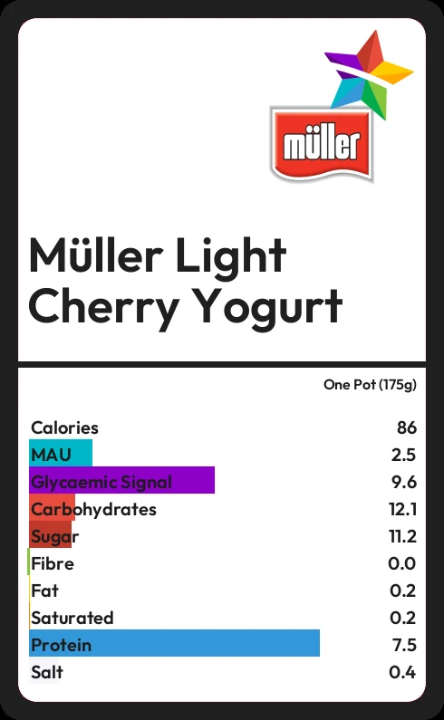 Müller Light Cherry Yogurt contains 11.2g sugar in one Pot (175g) - that is around 3 cubes of sugar.