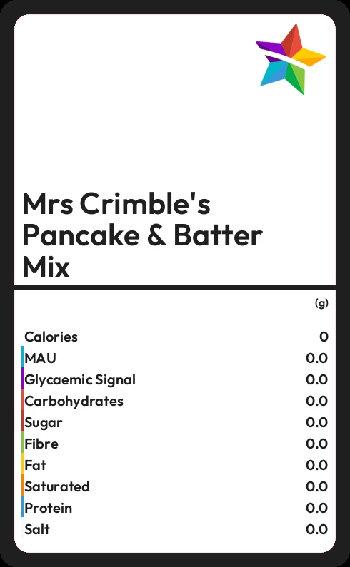 Mrs Crimble's Pancake & Batter Mix contains 143 calories in 100g.