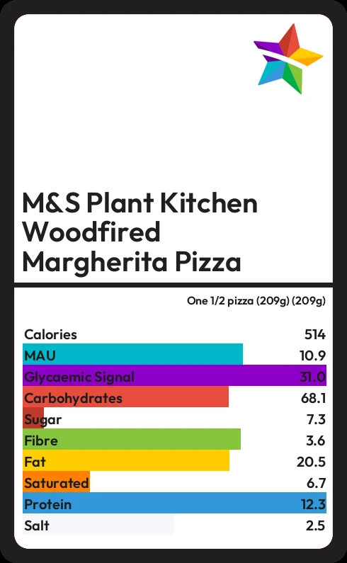 M&S Plant Kitchen Woodfired Margherita Pizza contains 514.1 calories in one 1/2 pizza (209g) (209g).