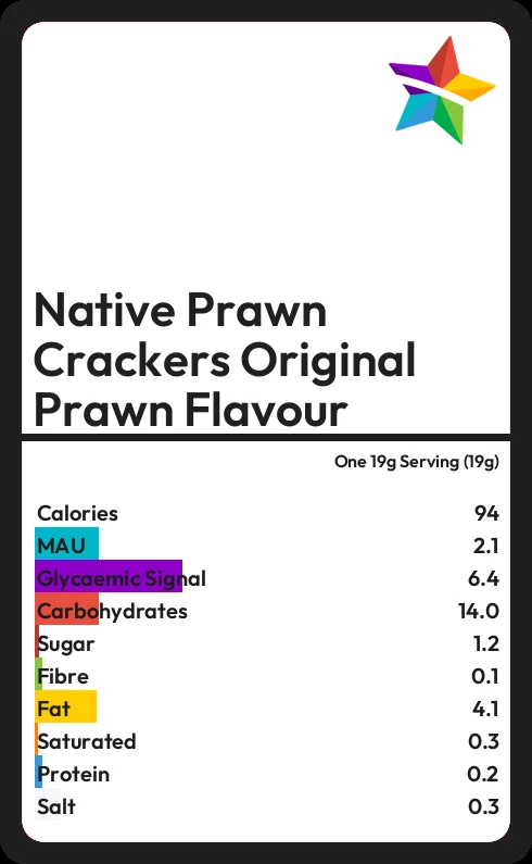 Native Prawn Crackers Original Prawn Flavour contains 1.2g sugar in one 19g Serving (19g)