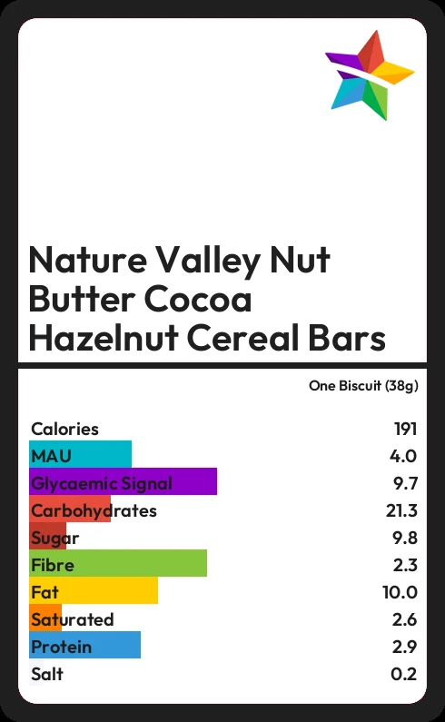 Nature Valley Nut Butter Cocoa Hazelnut Cereal Bars contains 9.8g sugar in one Biscuit (38g) - that is around 2 cubes of sugar.