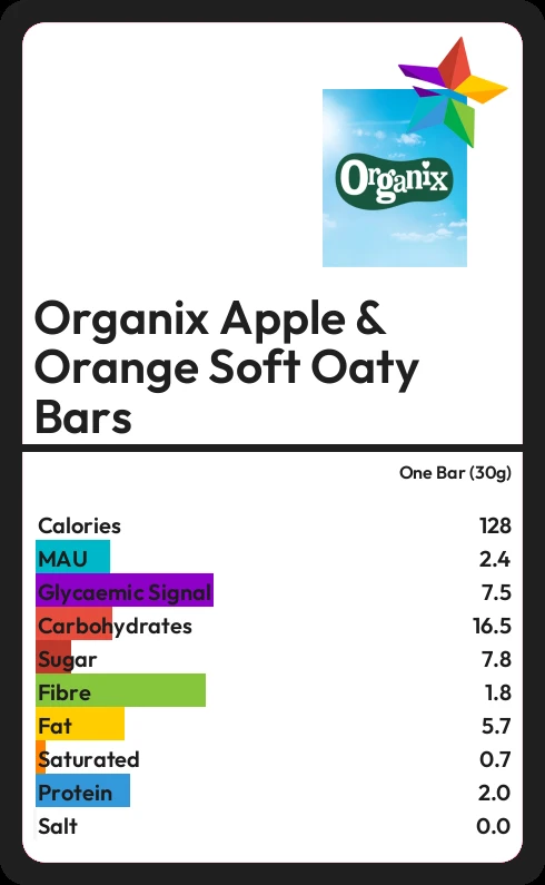 Organix Apple & Orange Soft Oaty Bars contains 127.8 calories in one Bar (30g).