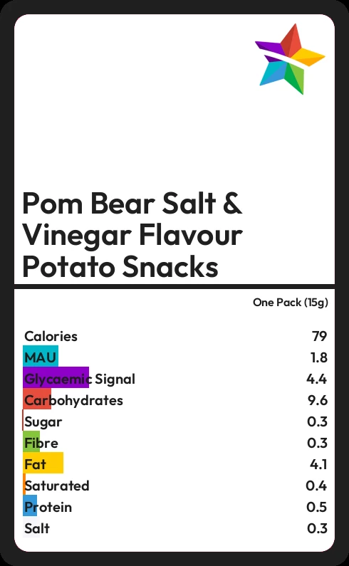 Pom Bear Salt & Vinegar Flavour Potato Snacks contains 0.3g sugar in one Pack (15g)