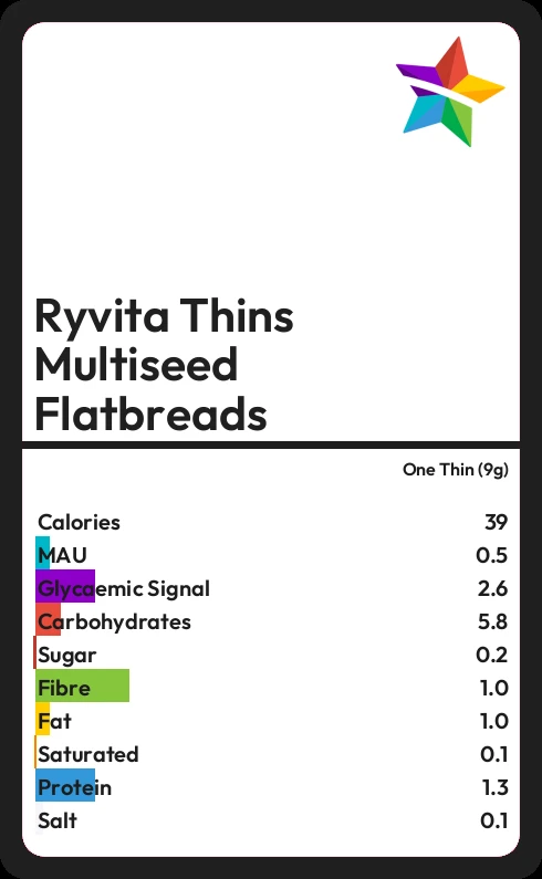 Ryvita Thins Multiseed Flatbreads contains 39.4 calories in one Thin (9g).