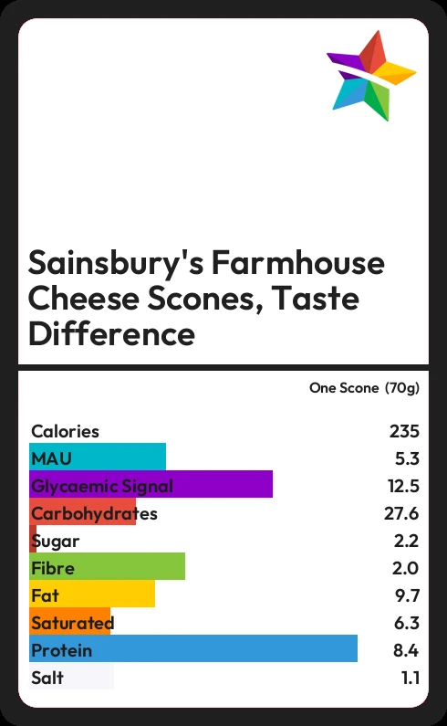Sainsbury's Farmhouse Cheese Scones, Taste Difference contains 235.2 calories in one Scone (70g).