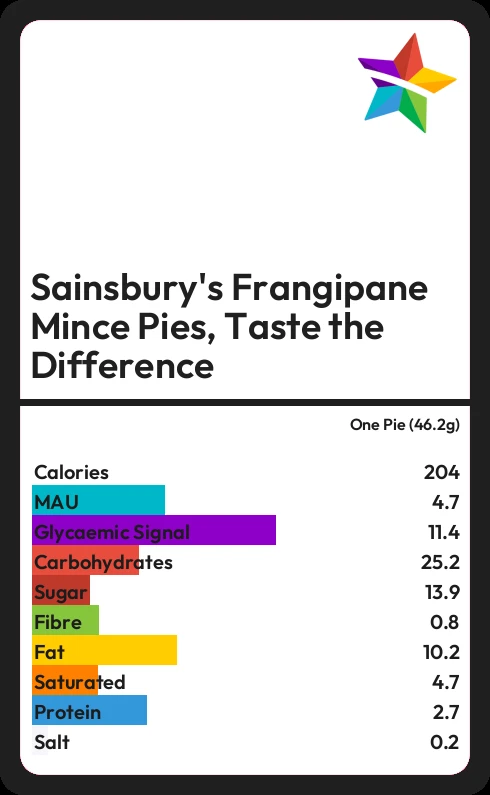In one Pie (46.2g) of Sainsbury's Frangipane Mince Pies, Taste the Difference there are 10.2g of fat of which 4.7g are saturated.