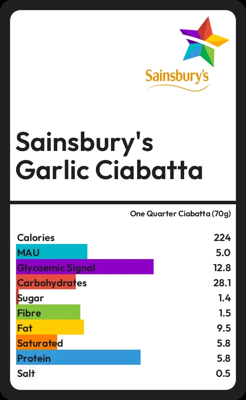 Sainsbury's Garlic Ciabatta contains 1.4g sugar in one Quarter Ciabatta (70g)