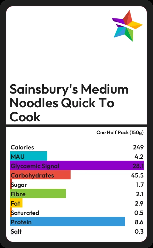 Sainsbury's Medium Noodles Quick To Cook contains 1.7g sugar in one Half Pack (150g)