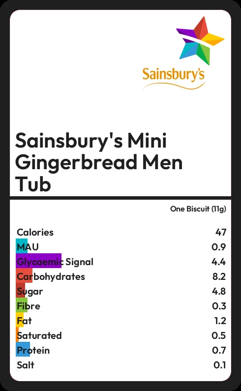 Sainsbury's Mini Gingerbread Men Tub contains 4.8g sugar in one Biscuit (11g) - that is around 1 cube of sugar.