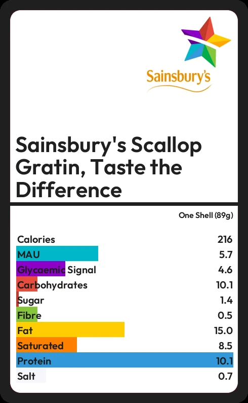 Sainsbury's Scallop Gratin, Taste the Difference contains 216.3 calories in one Shell (89g).