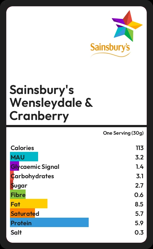 Sainsbury's Wensleydale & Cranberry contains 112.5 calories in one Serving (30g).
