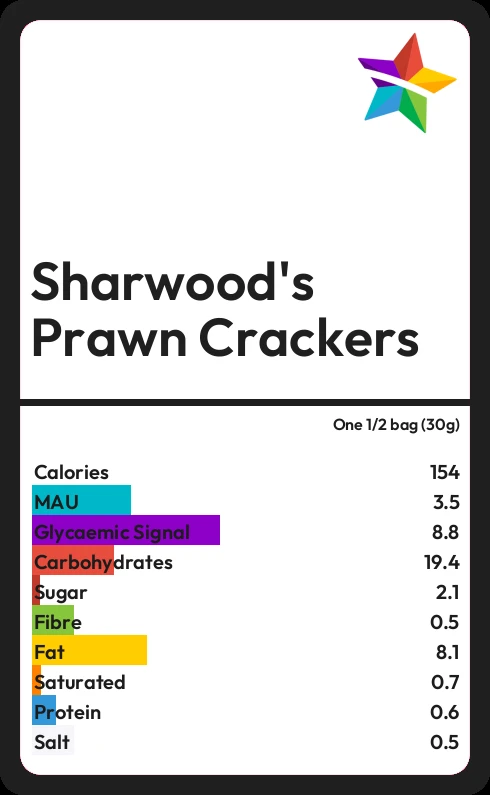 Sharwood's Prawn Crackers contains 2.1g sugar in one 1/2 bag (30g) - that is around 1 cube of sugar.