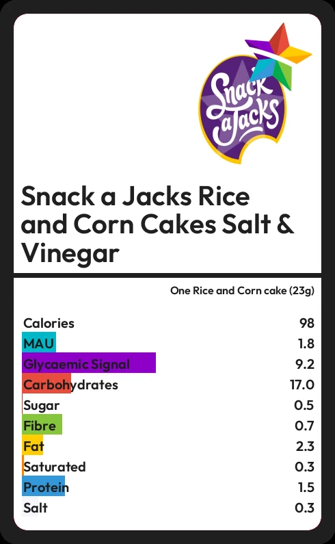 Snack a Jacks Rice and Corn Cakes Salt & Vinegar contains 98 calories in one Rice and Corn cake (23g).