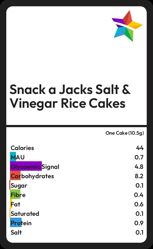 Snack a Jacks Salt & Vinegar Rice Cakes contains 0.1g sugar in one Cake (10.5g)