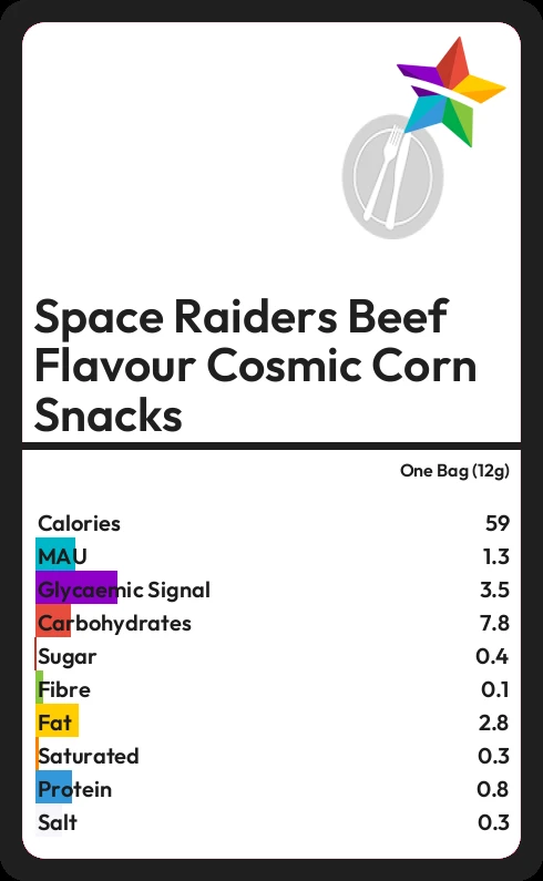 Space Raiders Beef Flavour Cosmic Corn Snacks contains 0.4g sugar in one Bag (12g)