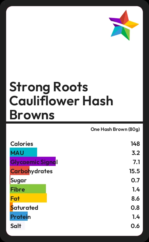 Strong Roots Cauliflower Hash Browns contains 0.7g sugar in one Hash Brown (80g)