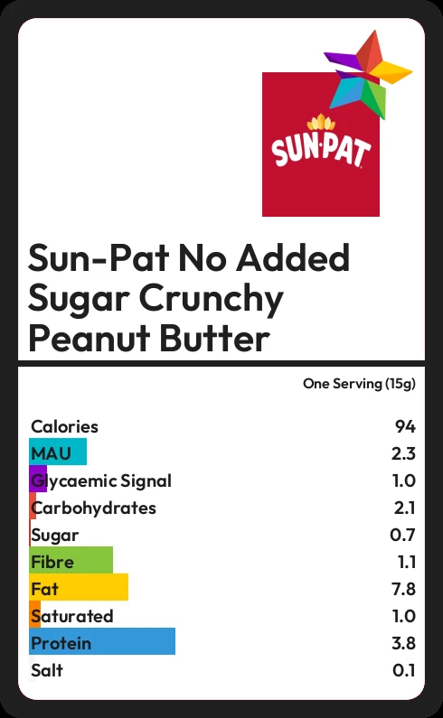 Sun-Pat No Added Sugar Crunchy Peanut Butter contains 0.7g sugar in one Serving (15g)