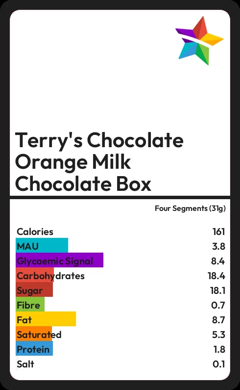In four Segments (31g) of Terry's Chocolate Orange Milk Chocolate Box there are 8.7g of fat of which 5.3g are saturated.