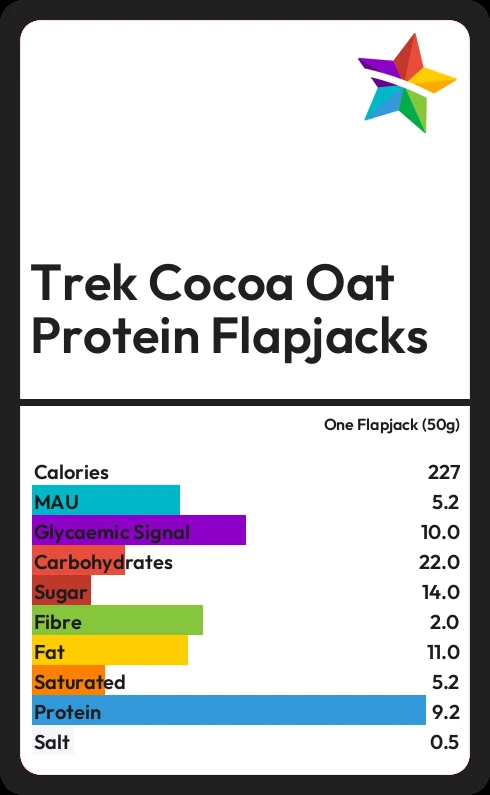 Trek Cocoa Oat Protein Flapjacks contains 227.5 calories in one Flapjack (50g).
