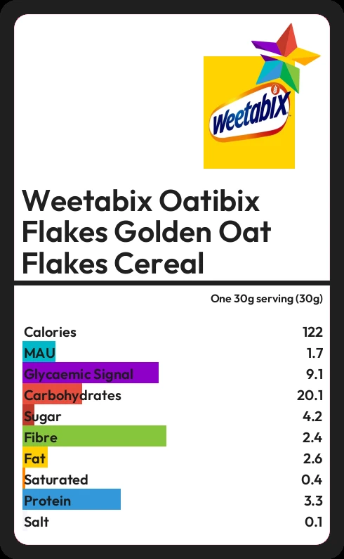 Weetabix Oatibix Flakes Golden Oat Flakes Cereal contains 122.4 calories in one 30g serving (30g).