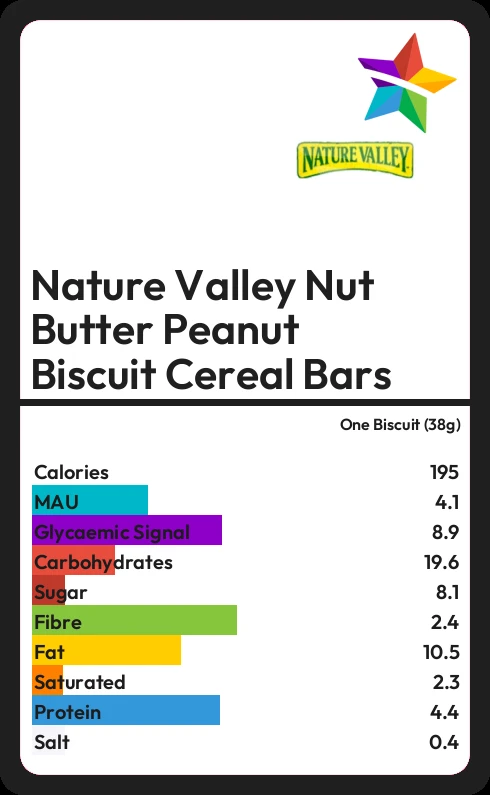 Nature Valley Nut Butter Peanut Biscuit Cereal Bars contains 8.1g sugar in one Biscuit (38g) - that is around 2 cubes of sugar.