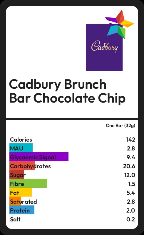 Cadbury Brunch Bar Chocolate Chip contains 142.1 calories in one Bar (32g).