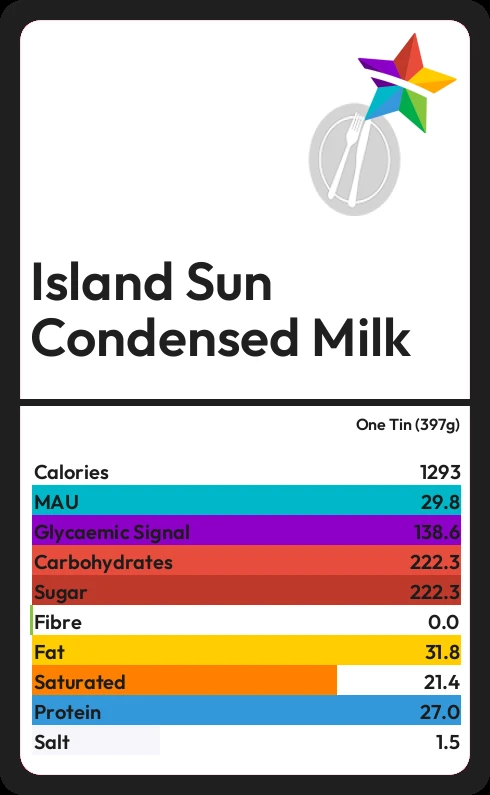Island Sun Condensed Milk contains 222.3g sugar in one Tin (397g) - that is around 56 cubes of sugar.