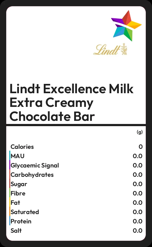 Lindt Excellence Milk Extra Creamy Chocolate Bar contains 50.0g sugar in 100g - that is around 13 cubes of sugar.
