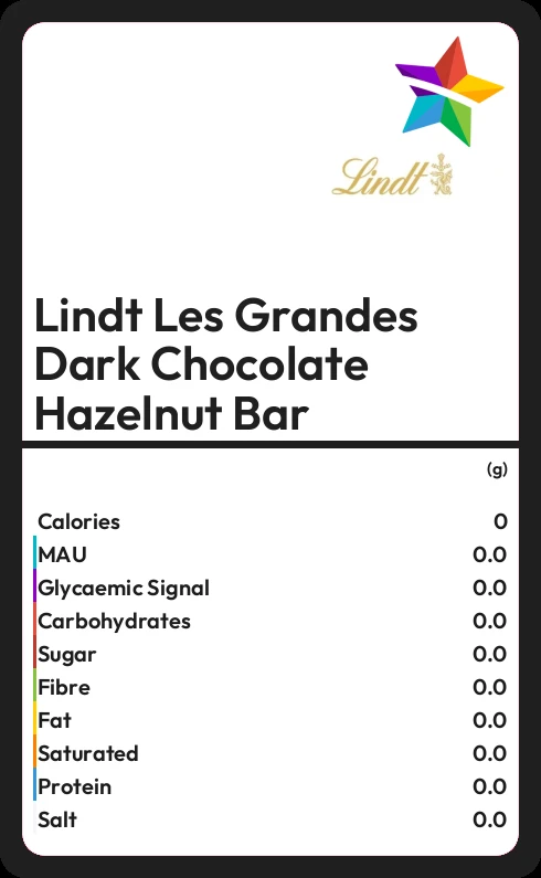 Lindt Les Grandes Dark Chocolate Hazelnut Bar contains 39.0g sugar in 100g - that is around 10 cubes of sugar.