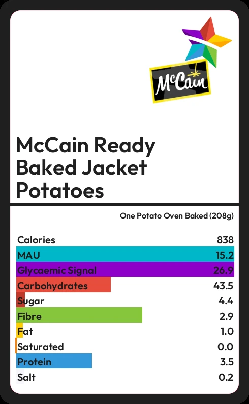 McCain Ready Baked Jacket Potatoes contains 4.4g sugar in one Potato Oven Baked (208g) - that is around 1 cube of sugar.