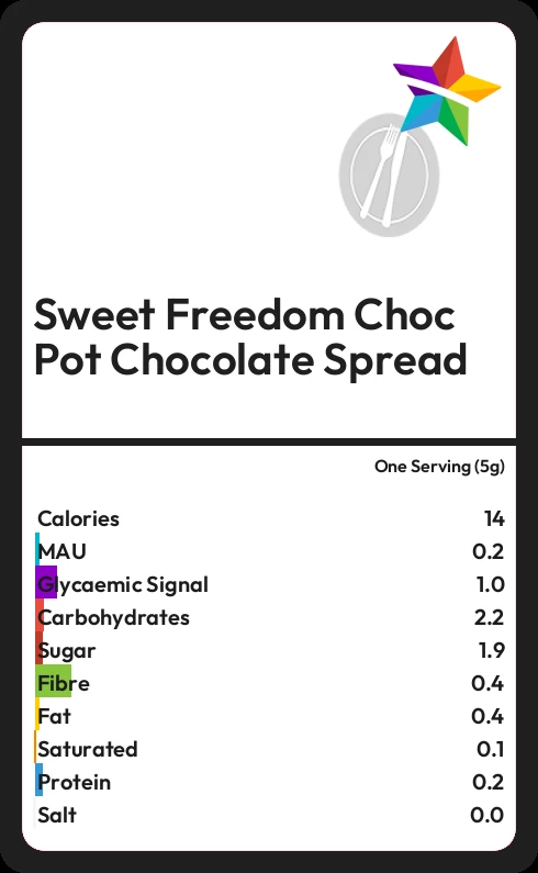 Sweet Freedom Choc Pot Chocolate Spread contains 1.9g sugar in one Serving (5g)