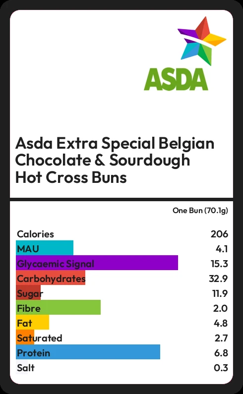 Asda Extra Special Belgian Chocolate & Sourdough Hot Cross Buns contains 206.1 calories in one Bun (70.1g).