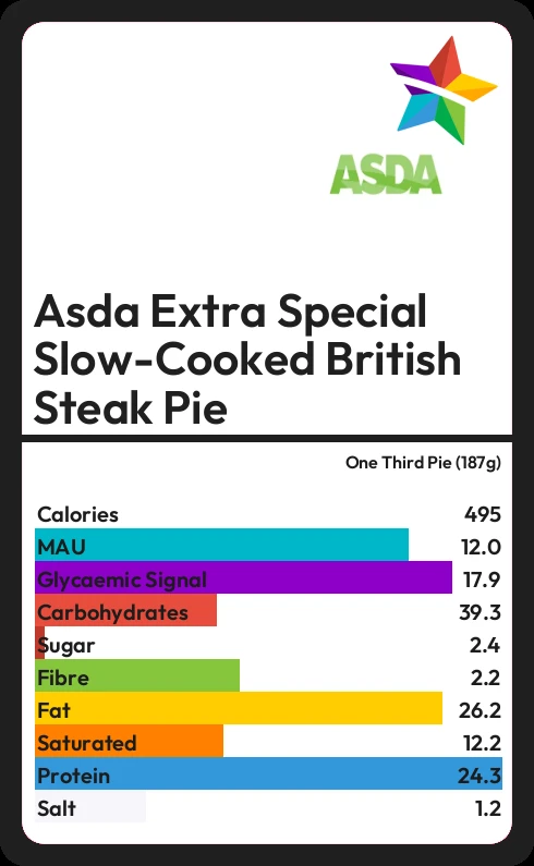 Asda Extra Special Slow-Cooked British Steak Pie contains 495.6 calories in one Third Pie (187g).