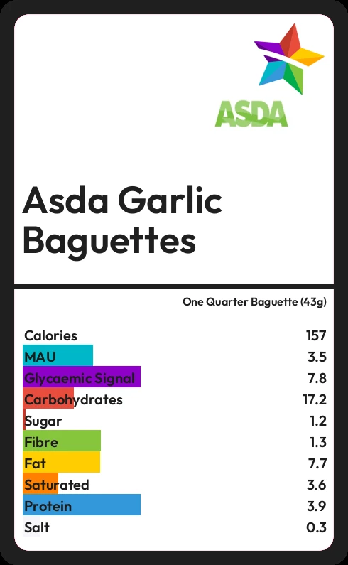 Asda Garlic Baguettes contains 1.2g sugar in one Quarter Baguette (43g)