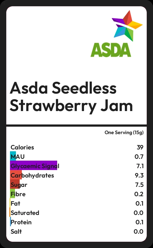 Asda Seedless Strawberry Jam contains 38.9 calories in one Serving (15g).