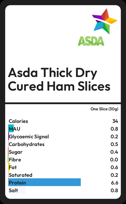 Asda Thick Dry Cured Ham Slices contains 34.2 calories in one Slice (30g).