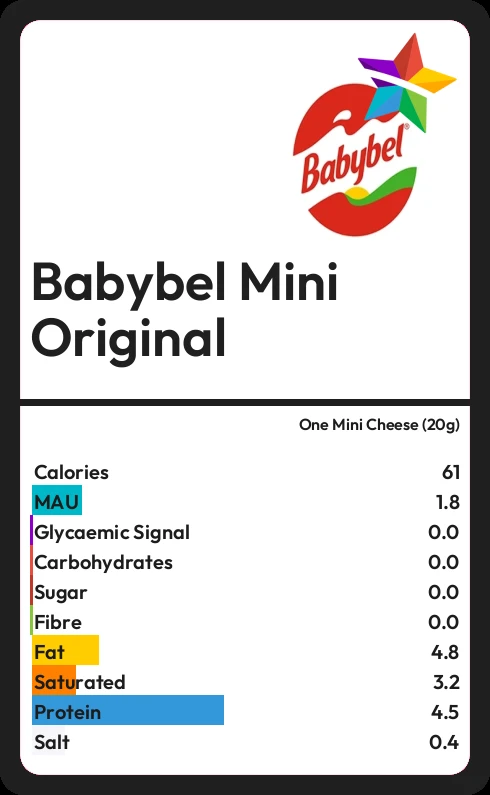 Babybel Mini Original contains 60.6 calories in one Mini Cheese (20g).