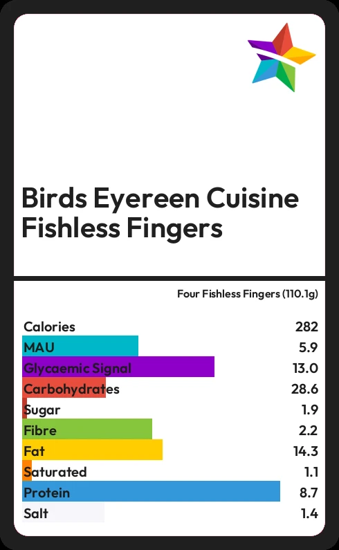 Birds Eyereen Cuisine Fishless Fingers contains 1.9g sugar in four Fishless Fingers (110.1g)