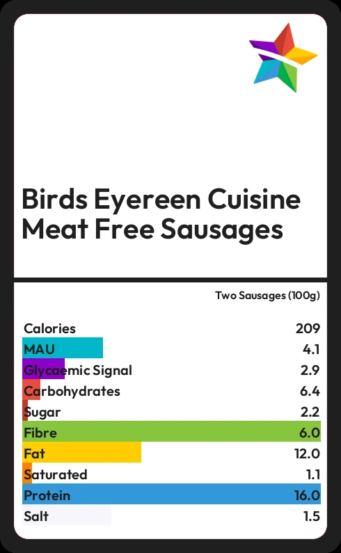 Birds Eyereen Cuisine Meat Free Sausages contains 209 calories in two Sausages (100g).