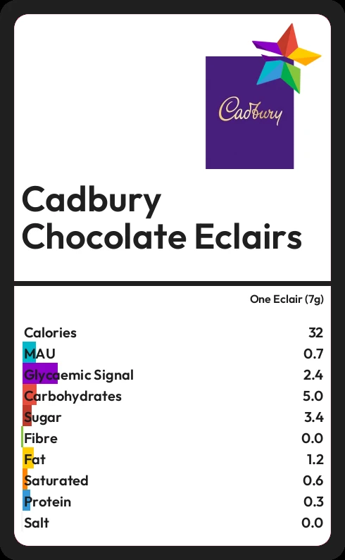 Cadbury Chocolate Eclairs contains 3.4g sugar in one Eclair (7g) - that is around 1 cube of sugar.