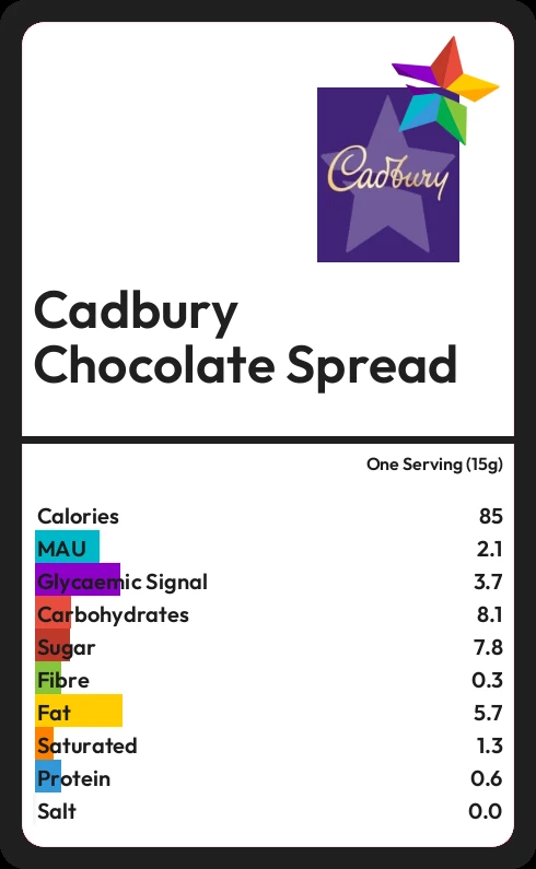 Cadbury Chocolate Spread contains 7.8g sugar in one Serving (15g) - that is around 2 cubes of sugar.